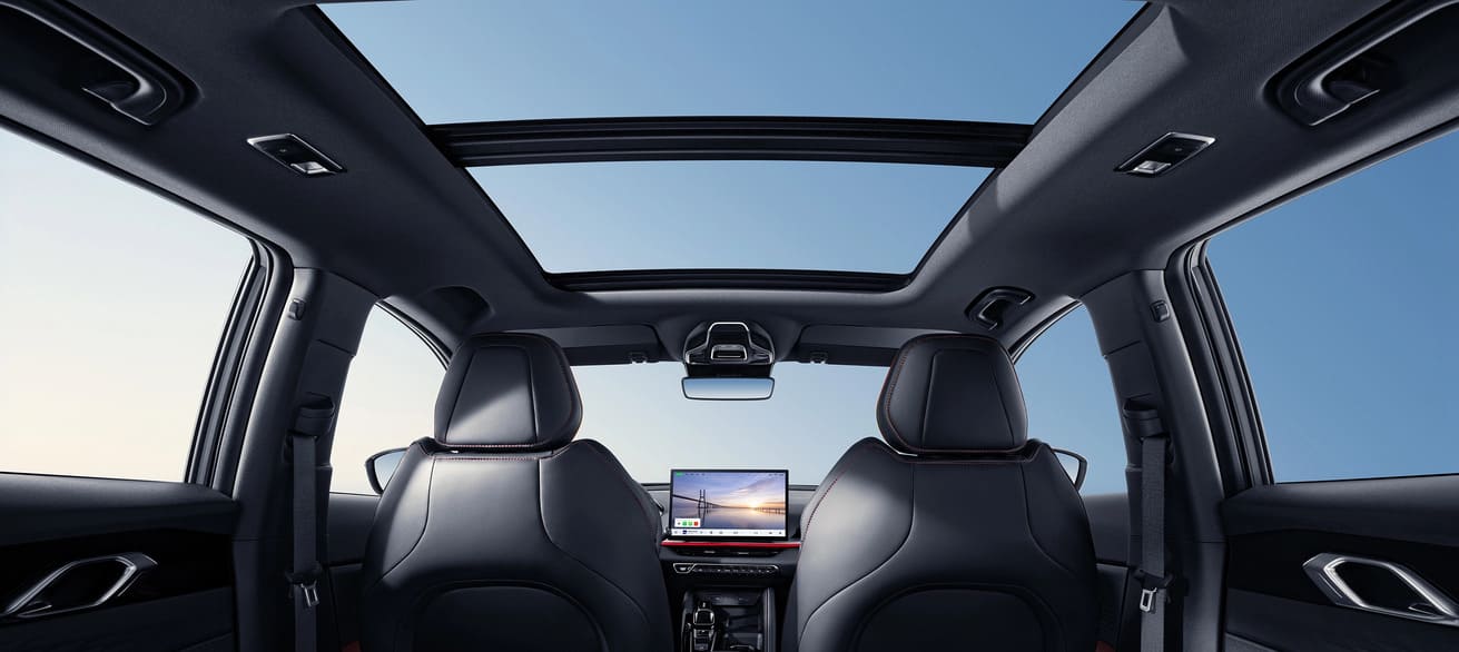 Панорамная крыша со сдвигающимся электрическим люком³ наполняет салон нового Belgee X50+ естественным светом и визуально увеличивает пространство внутри автомобиля.