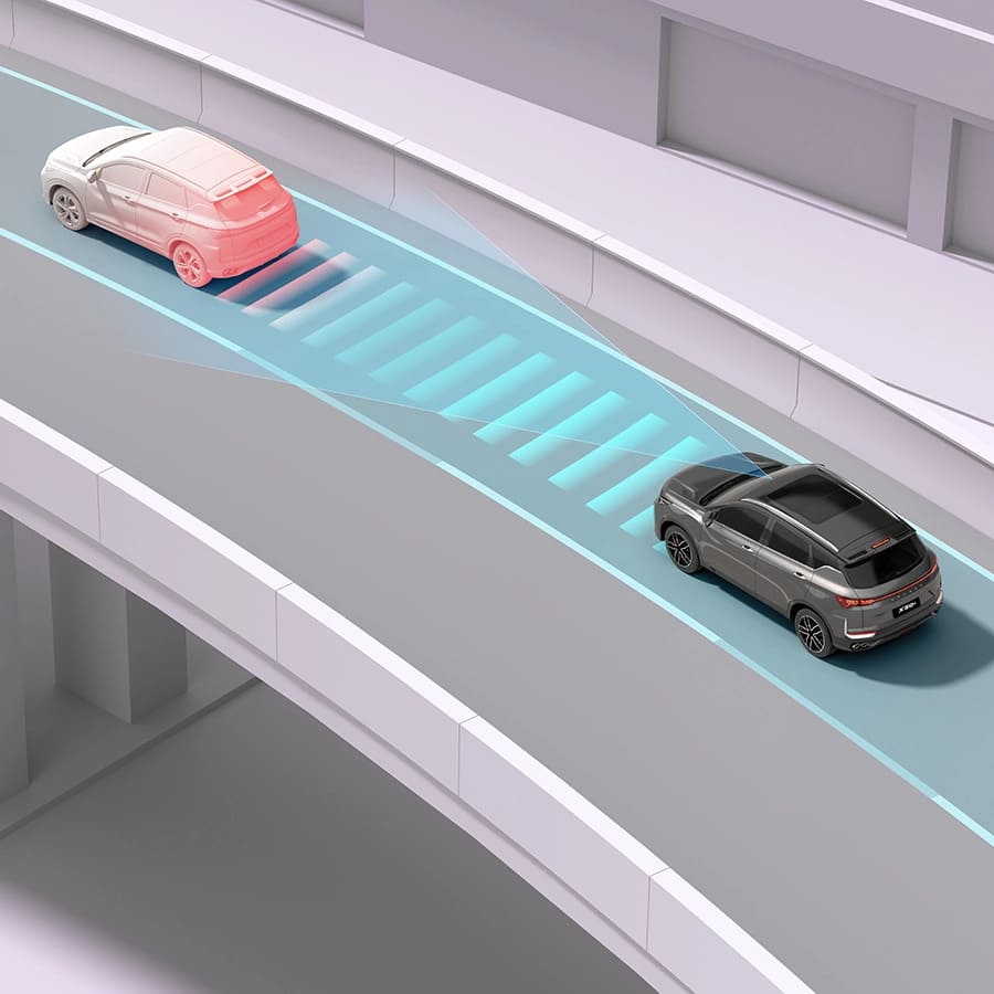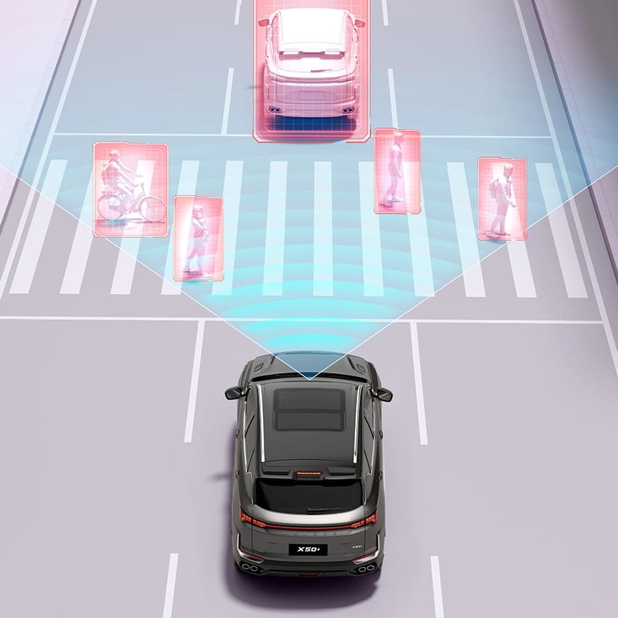Новый Belgee X50+ непрерывно отслеживает наличие других автомобилей в «слепых» зонах по обеим сторонам. При риске столкновения система подаёт звуковой сигнал и активирует световой индикатор в зеркалах. Система предупреждения при открывании дверей³ оповестит о приближающемся сзади транспорте, создающем помеху.